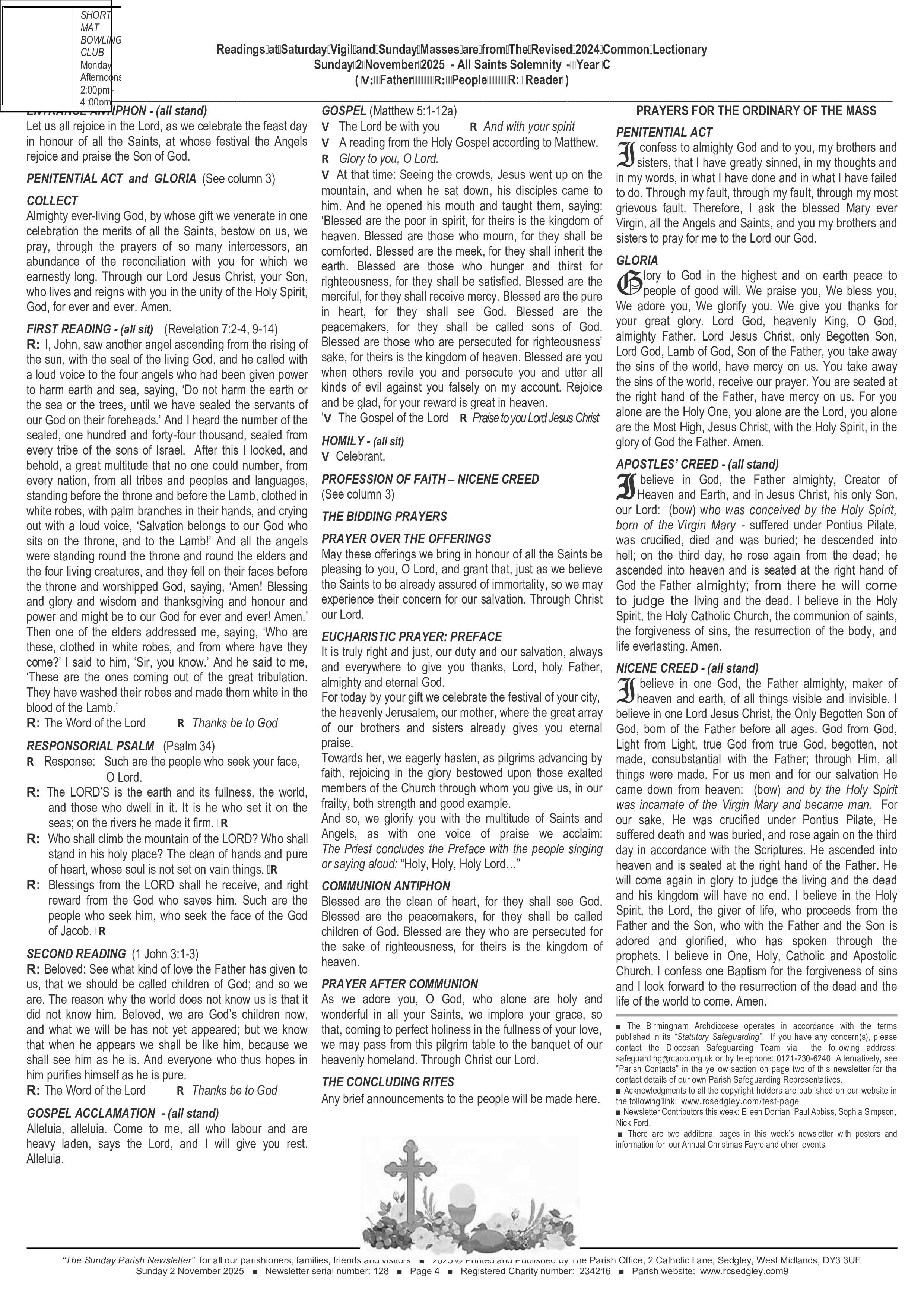 (3) Our newsletter is printed on double-sided sheets and includes the Readings and Responses for all Vigil and other Masses for this weekend.